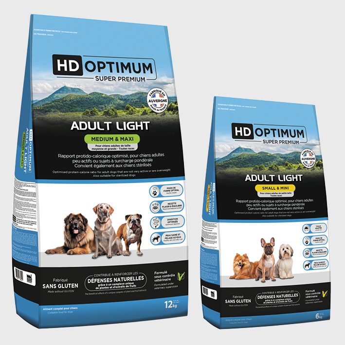 Création graphique et suivi technique d’un nouveau packaging, la gamme HD OPTIMUM de SAGA NUTRITION au positionnement premium, met en avant le made in Auvergne. elle est composée de 10 produits déclinés en différents volumes, à destination des chiens small&mini ou médium&maxi.